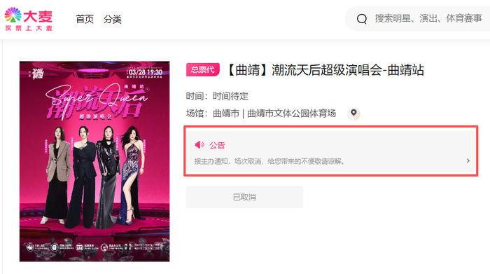 “潮流天后超级演唱会”曲靖站取消