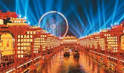 河北唐山河头老街景区内灯光璀璨,吸引众多游客前来游览。孙立君摄(人民图片)