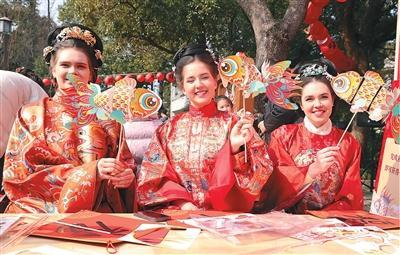 外国游客在浙江舟山马岙文廊集市体验鱼灯制作。陈永建摄(人民图片)