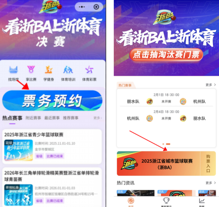 与2月4日(周三)“杭州VS丽水”场次的线上购票通道一致,第四场比赛同样以“浙体育”微信/支付宝小程序票务预约系统为官方指定唯一购票入口,请广大球迷朋友们切勿轻信网络非官方售票信息。