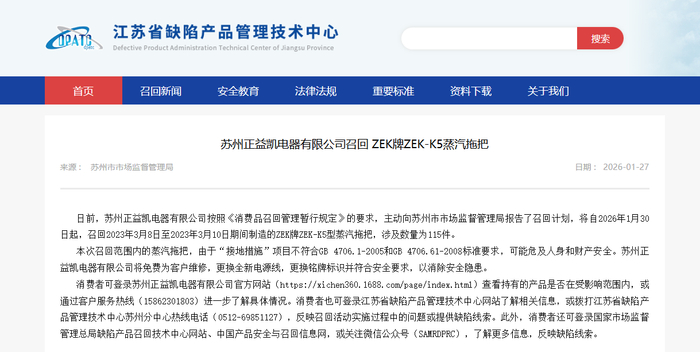 中国质量新闻网讯 据江苏省缺陷产品管理技术中心网站消息,日前,苏州正益凯电器有限公司按照《消费品召回管理暂行规定》的要求,主动向苏州市市场监督管理局报告了召回计划,将自2026年1月30日起,召回2023年3月8日至2023年3月10日期间制造的ZEK牌ZEK-K5型蒸汽拖把,涉及数量为115件。