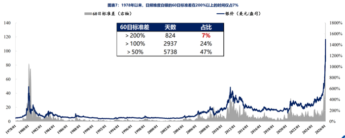 历史数据显示,自1978年以来,白银的60日标准差(衡量波动率的指标)在93%的时间里都维持在200%以下。这代表了市场的常态。然而,白银暴跌前的波动率已经飙升至惊人的1800%以上。