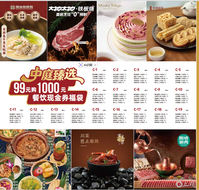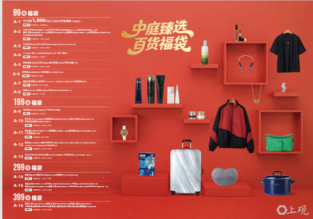 其中,食品餐饮福袋依然热门,99元档位即可解锁多重惊喜,涵盖果栗园200元提货券、小罐茶匠心系列、奇华点心套餐、Ole海陆年货套餐等,最高价值超400元;99元购千元的餐饮福袋堪称“性价比之王”,每年都“提前售罄”;299元福袋则涵盖海蓝之谜在内的国际一线化妆品;高价位福袋则汇聚更多优质好物,如699元可购买五粮液普五八代52度500ml+小金锤经典赤霞珠干红葡萄酒750ml*2,满足不同消费群体的个性化需求。