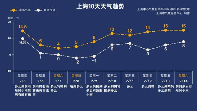 上海市气象服务中心介绍,上海今天(2月5日)白天天空阴沉,偶有短时小雨,但气温并不算低,市区徐家汇站最高气温为14.5℃,东北风3~4级,体感不冷。