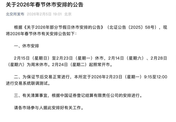 此外,为保证节后交易正常进行,北交所定于2026年2月23日(星期一)9:15至12:00进行交易系统联调测试。
