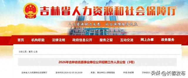 2月5日,吉林省人力资源和社会保障厅网站发布2026年吉林省省直事业单位公开招聘工作人员公告(3号),详情如下: