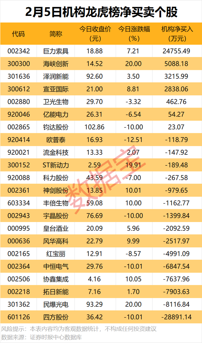 今日龙虎榜中,机构净买入个股有7只,净卖出的个股有15只,4股净买入金额均超2000万元。巨力索具获机构净买入2.48亿元,居首;其次是海峡创新、泽润新能,净买入金额分别为5088.18万元、3215.99万元。