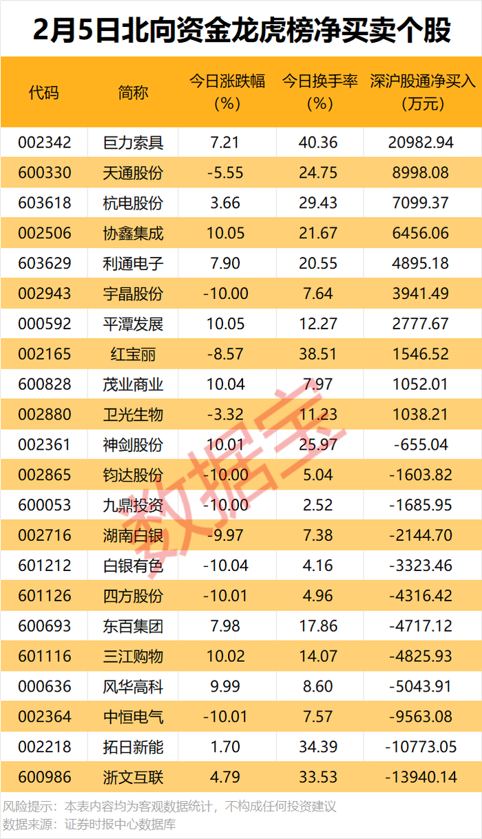 今日龙虎榜现身个股中,10股获北向资金净买入。净买入居首的是巨力索具,金额为2.1亿元;天通股份、杭电股份均获净买入超7000万元。