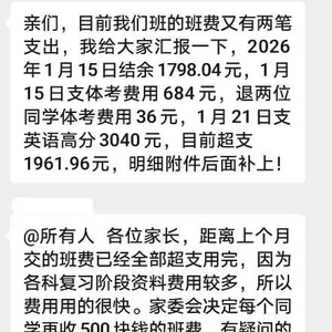 2025年10月14日,该家委会在微信群里称,“从上学期到现在,班费还剩756.77元,考虑到娃娃们初三了,班级开支和各种资料用到的费用会更多,现在的班费已经完全不能支付下次的费用,现家委会决定向每位同学收取500元班费。”