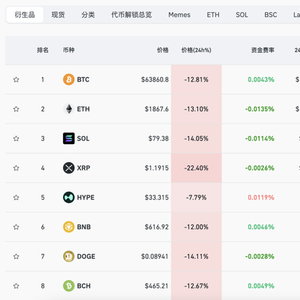 周四美股交易时段,加密货币市场全线崩盘,比特币加速下挫至6.3万美元附近,截至北京时间06:30,日内跌幅扩大至12.81%,报63860.8美元/枚;以太坊日内暴跌13.1%,XRP暴跌超22%,SOL、狗狗币暴跌超14%,BNB暴跌超12%。