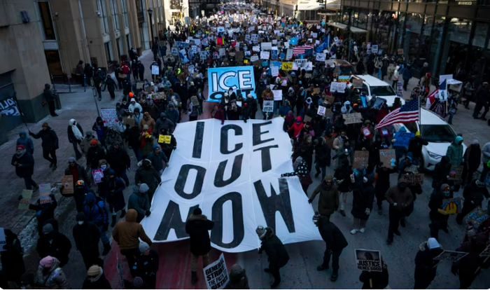 美国人抗议移民局的集会活动此起彼伏。这是2026年1月30日,在明尼苏达州明尼阿波利斯市,一场反对移民海关执法局(ICE)执法行动的“全国大罢工”示威活动正在进行。CNN截图