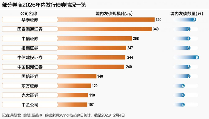 截至2月4日,华泰证券、国泰海通证券自2026年以来分别发行了350亿元、340亿元债券,为年内发债规模最大的两家券商;紧随其后的是中信证券、招商证券、中信建投证券、中国银河证券,发债规模分别为268亿元、247亿元、244亿元、240亿元。