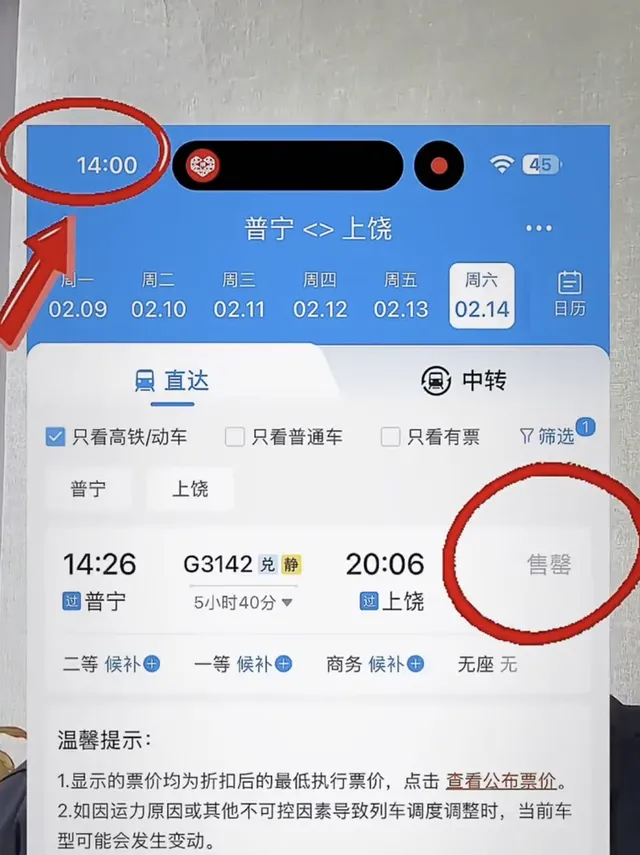 该段视频显示,网友计划购买2月14日从广东普宁前往江西上饶的G3142次列车,该趟列车于1月31日下午2点开售。从下午1点59分起,网友便不断刷新购票平台的售票页面,时间跳转至2点时,网友刷新页面,却显示该区间车票已售罄,二等座、一等座及商务座均处于候补状态。