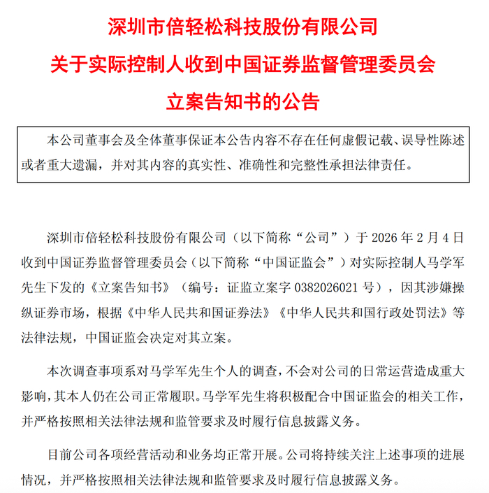 仅在一个多月前的2025年12月25日晚,倍轻松便已发布公告称,公司于12月25日收到中国证监会下发的《立案告知书》,因公司及实际控制人马学军涉嫌信息披露违法违规,根据相关法律法规,中国证监会决定对公司及实际控制人马学军立案。