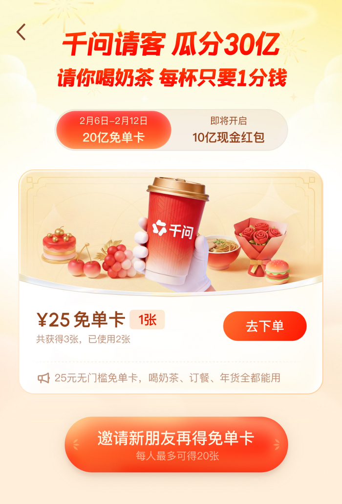 千问App活动页面显示,第一波免单活动时间为2月6日-2月12日。用户更新千问App后,可获得一张25元无门槛免单卡,不仅能免单喝奶茶,也能通过淘宝闪购买年货、点外卖。