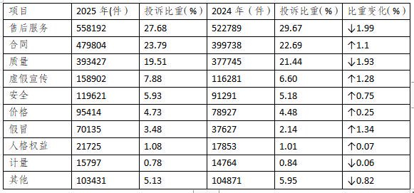 与2024年相比(如表1所示),假冒、虚假宣传、合同问题投诉比重上升,售后服务、质量、其他问题投诉比重下降。