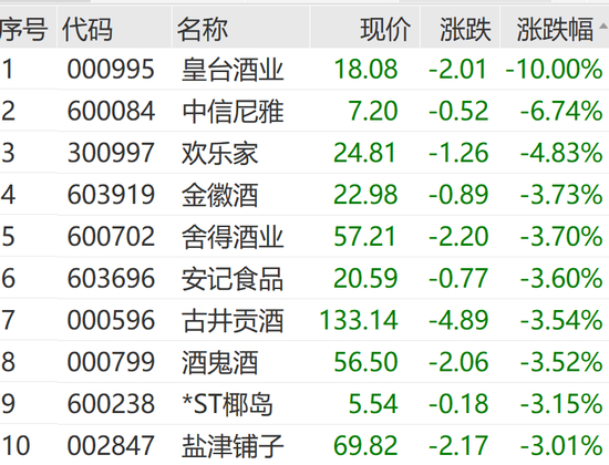 白酒股集体回调,中信尼雅跌超6%,欢乐家、金徽酒、舍得酒业等跌幅居前。