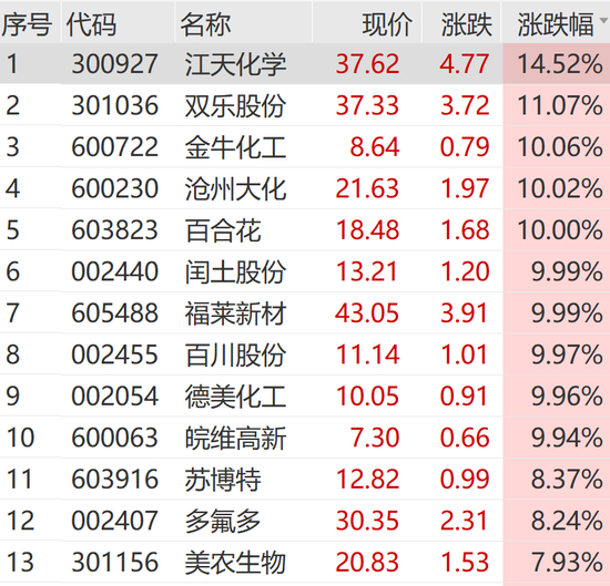 个股方面,金牛化工直线拉涨停,沧州大化、百合花、闰土股份等多股纷纷涨停,江天化学、双乐股份涨超10%。