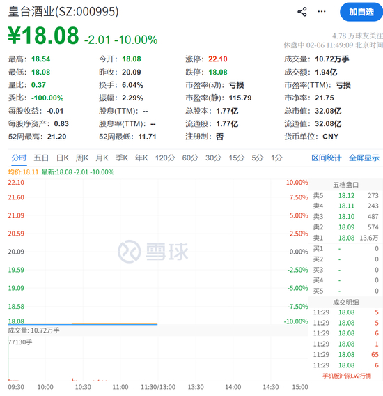 2月6日上午,皇台酒业一字跌停,截至午间收盘,为市场上唯一一只跌停股。