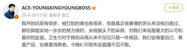 黄子韬在个人微博发文回应央视探访卫生巾工厂:“我开的玩笑有很多,被打脸的事也有很多,但是真正做事情的饼从来没有白画过,都在脚踏实地一步步的努力做好。央视镜头下的朵薇,对我们来说是最大的认可和最好的监督。卫生巾对于我和朵薇从来不仅仅只是一件商品,我们会尊重自己、尊重产品、也尊重消费者。”