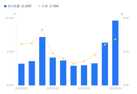 近一年(2025年2月28日至2026年1月30日),大港股份A股股东户数从9.83万户,增加至11.09万户,增幅12.84%,区间股价上涨12.25%。
