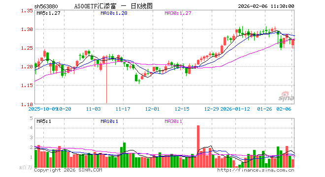 2月6日,截止午间收盘,A500ETF汇添富(563880)涨0.16%,报1.271元,成交额1.00亿元。A500ETF汇添富(563880)重仓股方面,宁德时代截止午盘涨2.52%,贵州茅台跌2.68%,中国平安跌0.88%,中际旭创跌0.57%,紫金矿业涨0.27%,招商银行跌0.65%,新易盛跌2.14%,美的集团跌0.89%,兴业银行跌0.27%,长江电力跌0.56%。