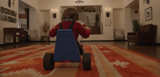 如果说,对称构图和广角镜头的透视,在水平线上撑开了瞭望整个酒店的布局,斯坦尼康(Steadicam)则直捣心理暗示的纵深和隐秘。这项当时发明不久的技术乃影片标志性的创举。当丹尼蹬着脚踏车飞驰过狭长的酒店走廊时,摄影机采用低机位,几乎像是融进了地板一样。