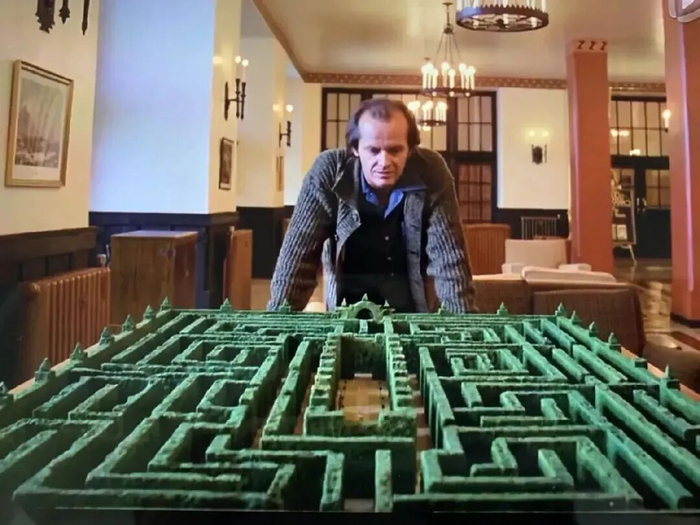 还有那个格外诡异的镜头:杰克俯瞰迷宫的模型时,温蒂和丹尼竟在其中行走,成了蚂蚁般的小人。