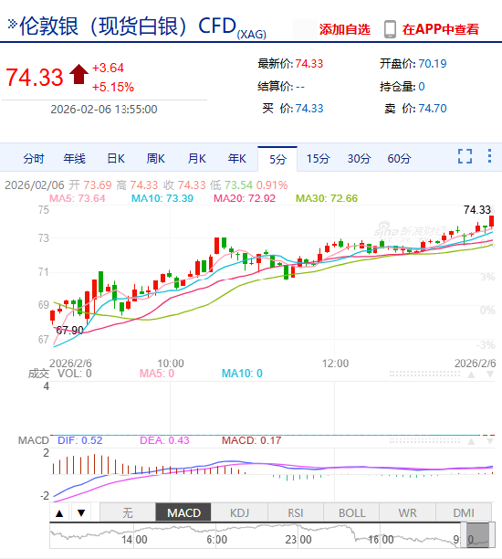 日内大涨5.00%,现报74.34美元/盎司。