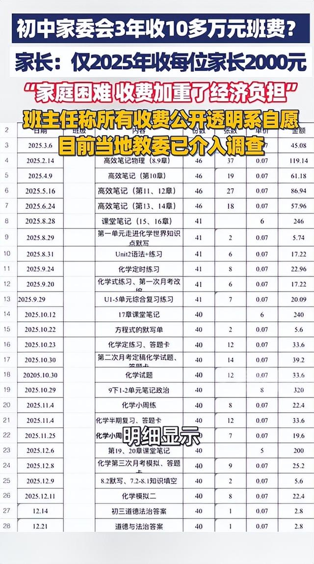 重庆一家长举报家委会3年收10多万班费 班主任称所有收费公开透明系自愿,“ 没管过钱”,当地教委介入调查