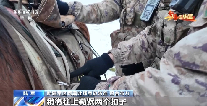 总台央视记者 刘洁:官兵们正在进行骑马巡逻的准备,每匹军马都系上了鲜艳的红头绳,给冬日的边关带来了暖暖的年味。这些军马是官兵们巡逻途中最亲密的战友,今天他们再一次踏上边防巡逻路,用坚守迎接新春。