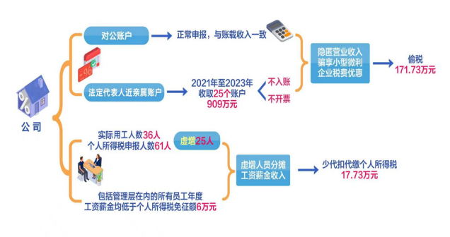 经查,扬州春风船舶机械制造有限公司为违规享受小型微利企业相关税费优惠,通过个人账户收款的方式,隐匿收入、进行虚假纳税申报,少缴增值税、企业所得税等税费共计171.73万元。同时,通过虚增人员、分摊员工工资薪金等方式,违规少代扣代缴个人所得税17.73万元。