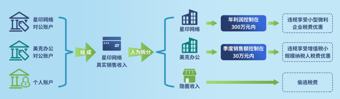 近期,国家税务总局铜陵市税务局稽查局依法查处安徽星印网络科技有限公司(以下简称“星印网络”)骗享增值税小规模纳税人、小型微利企业税费优惠偷税案件。经查,2022年至2024年,该公司通过设立空壳个体工商户,将本属于公司的营业收入拆分至空壳个体工商户,并以个人银行账户收款隐匿收入等手段,进行虚假纳税申报,违规享受增值税小规模纳税人、小型微利企业税费优惠,少缴增值税、企业所得税等税费共计160.80万元。2025年9月,国家税务总局铜陵市税务局稽查局依法对其作出追缴税费款、加收滞纳金并处罚款共计286.13万元的处理处罚决定。目前,涉案税费款、滞纳金及罚款均已追缴入库。