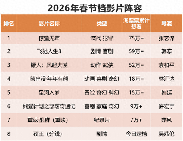 从 “想看”数据来看,《惊蛰无声》《飞驰人生3》《镖人:风起大漠》构成头部主力阵营,《熊出没·年年有熊》《星河入梦》及《熊猫计划之部落奇遇记》则各守类型基本盘。灯塔专业版前瞻分析认为,2026年春节档电影市场或从2025年春节档的“一超多强”回归“多强争霸” 格局。