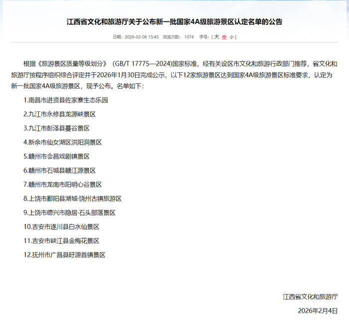 2月6日,江西省文化和旅游厅发布新一批国家4A级旅游景区认定名单的公告,12家旅游景区达到国家4A级旅游景区标准要求,认定为新一批国家4A级旅游景区。