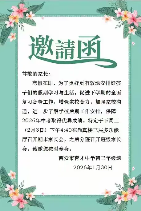 期末考试是过往耕耘与收获的答卷,农历新年是孕育希望的崭新起点——正如冬雪之下,生命默默积蓄力量,静待春日绽放。本次期末家长会既是一次充满诚意的教育复盘,也是一次坚定信心的力量汇聚。家校将继续同心同德、握指成拳,期待育才校园三载滋养的学子,在明年六月收获硕果!