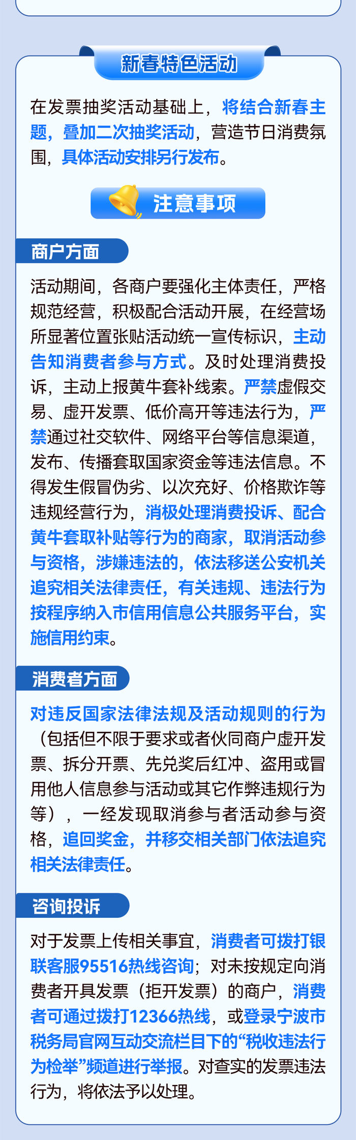 宁波市税务局相关负责人表示,对参与活动的发票进行审核校验的同时,将对后续相关情况跟踪监控,防止有些不法分子、不良商家利用“有奖发票”活动违法获取不当利益,保障真实消费者的权益,推动活动效应可持续发挥。