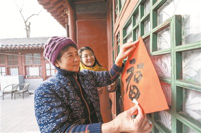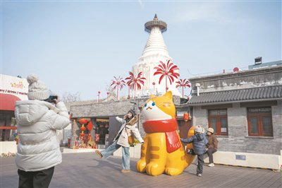 新春佳节临近,308米长的宫门口东西岔胡同灯火通明,读鲁迅、转白塔、逛东西岔、欢迎中国年等彩灯字样悬挂在胡同上空,与胡同街面两旁大树上的彩灯汇成一片,形成了璀璨灯海。这些街面彩灯、马年元素的装饰、悬挂红灯笼、大门福字与窗花,均是从元旦就开始布置的,为的是让这条街上商户、居民、游客在这里共享年味。