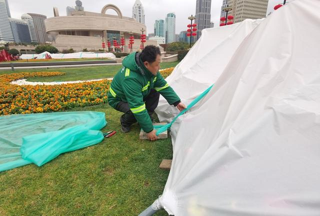 下午,上海人民公园经营管理有限公司广场班组的师傅们正在冒雨加固连夜盖好的保温膜,让花儿熬过寒潮,在春节期间美美绽放。