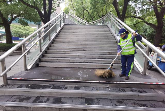 等预警发布再动,不一定及时发现问题隐患,关键工夫还在平时。下午,雨势渐大,延安东路西藏中路交叉口西北面的天桥阶梯有积水。人民广场班组清道员原兰英立刻拿起扫帚簸箕除水,再铺上麻袋:“这个阶梯有41个台阶,从下往上数第三个台阶因为中央有点凹进去,容易积水,我巡检时总要留意。”
