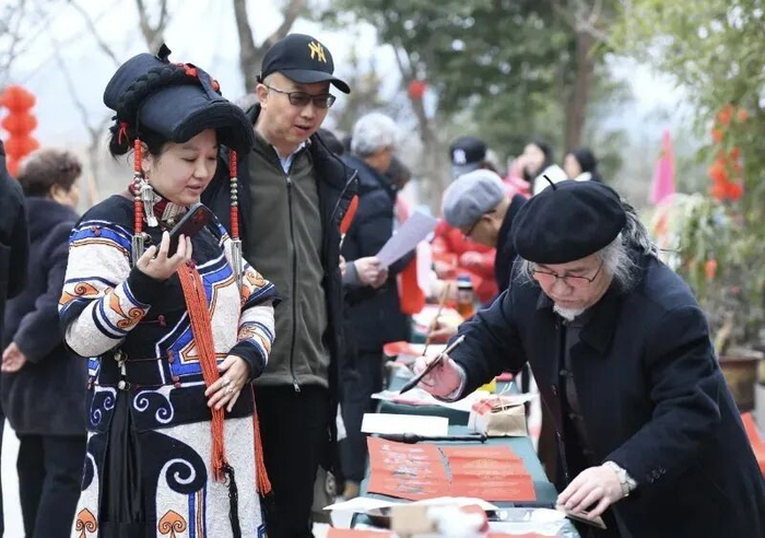 1月31日,成都龙泉驿区十陵街道综合文化活动中心内暖意融融、翰墨飘香,乐动蓉城·书香十陵——成都市书画名家“万福迎春”文化惠民活动在此举行。来自成都市书法家协会、美术家协会的十余位名家铺纸研墨,即兴挥毫:一幅幅笔力遒劲、寓意美好的春联,一个个形态各异、气韵生动的“福”字,在书画家们腕底生成,送到排队等待的社区居民手中。
