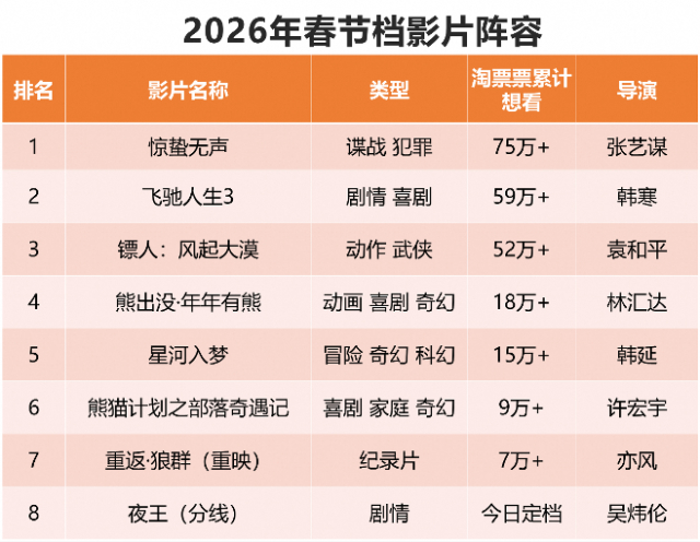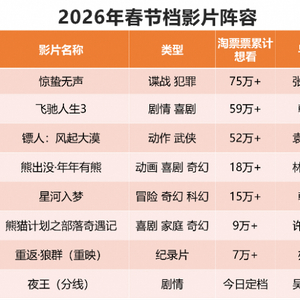2月6日,灯塔专业版发布《2026年春节档前瞻》。截至目前,已有8部影片定档2026年春节档。从 “想看”数据来看,《惊蛰无声》《飞驰人生3》《镖人:风起大漠》构成头部主力阵营,《熊出没·年年有熊》《星河入梦》及《熊猫计划之部落奇遇记》则各守类型基本盘。灯塔专业版前瞻分析认为,2026年春节档电影市场或从2025年春节档的“一超多强”回归“多强争霸” 格局。