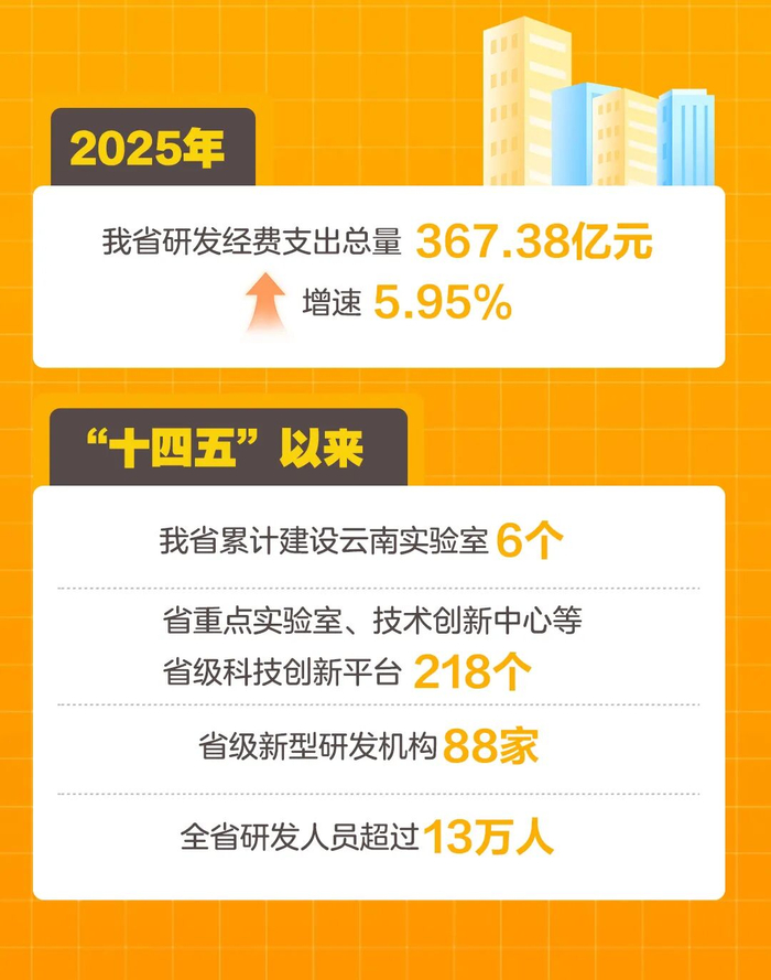 “十四五”以来,云南深入实施科教兴滇战略、人才强省战略和创新驱动发展战略,全省研发投入经费总量持续提升,较“十三五”末增长49.3%,研发投入强度从1%提升至1.17%;高新技术企业数量超过4100家,增速连年保持全国前列,科技实力跃上新台阶,科技创新为全省经济社会高质量发展提供了有力支撑。