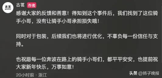 记者注意到,古茗官方也通过社交账号回应称,得知这起事件后,已找到了这位骑手小哥,没有让骑手小哥承担损失。同时对于包装,后续也将进行优化。