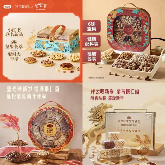 沃尔玛自有品牌“沃集鲜”和小红书联合推出的“硕果奔腾”礼盒,1.3kg 内含巴旦木、腰果、混合果仁、碧根果、夏威夷果等10盒纯果仁,售价269元;非联名的1.4kg 礼盒则包含6种纯坚果。