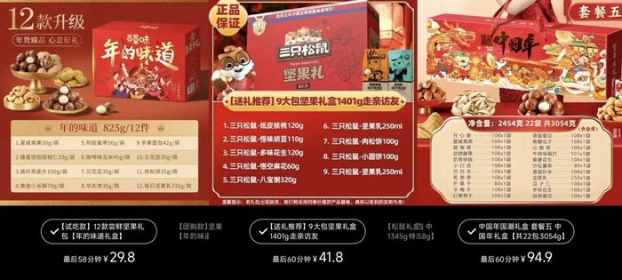 整体来看,当礼盒价格达到百元以上,品牌往往会在宣传中强调“纯坚果”“原产地”“多品类果仁搭配”等卖点,非坚果零食在组合中的存在感明显降低。