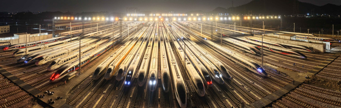 2月1日,动车组列车停靠在广州动车段存车场。新华社记者 邓华 摄