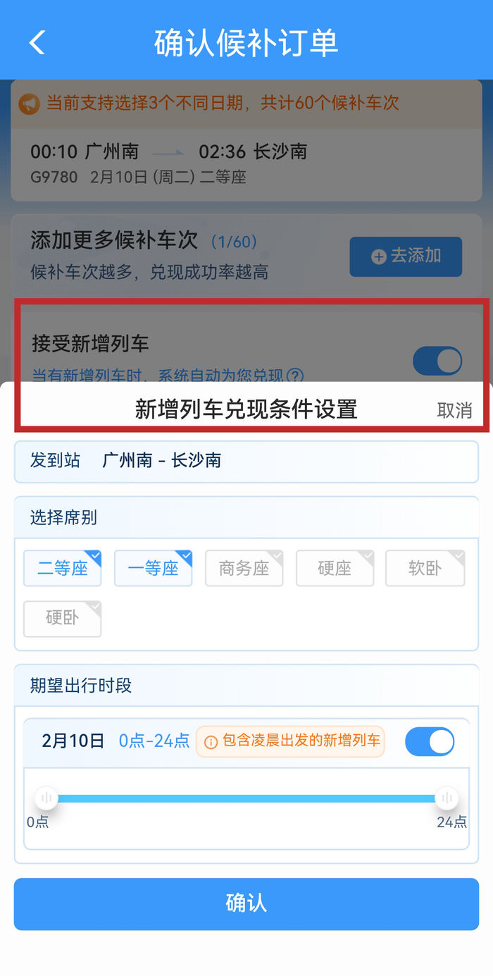 二是加开临时列车。比如:保证检修前提下,将2月6日至8日的首趟动检列车提前20分钟开出,这短短的20分钟就能加开4趟临时列车,实现了将近4千张候补车票兑现。2026年春运开启以来,国铁广州局紧盯候补数据,最大限度加开、重联动车组,实现“一日一图”,每天根据新的线路图开行列车。春运首日,根据车票和候补数据,国铁广州局开行列车3272列,比去年多开69列。春运期间,预计单日最高可安排开行旅客列车4499列,同比增长9.8%。如何提高“候补”成功率?提交候补时,如何才能成功“兑现”?铁路部门为大家支了“三招”。——拉满60个候补组合在12306App上,每个用户能同时提交6个候补订单,每个订单可选3个乘车日期,最多能凑60个“日期+车次”组合,还能勾选多个席别。温馨提示:别“死磕”某一趟车,多个时间段的车次都选上,组合越多,匹配概率越高。