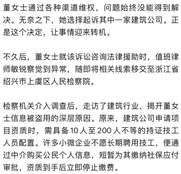 董女士查询后才发现,2021年至2023年,她博士在读期间,名下竟有六家浙江省内不同城市建筑公司的社保缴费记录,而她从未在这些公司工作过。这些异常记录让董女士失去应届毕业生资格,考公、人才补贴等切身利益受到直接影响。