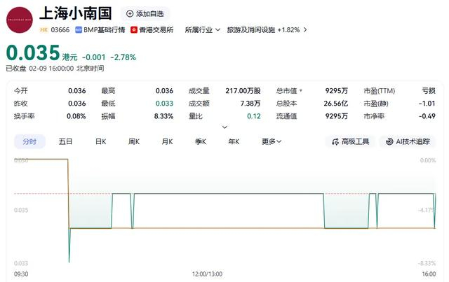 2月9日,上海小南国盘中一度下跌8.33%,截至收盘,该股跌幅为2.78%,报0.035港元/股。